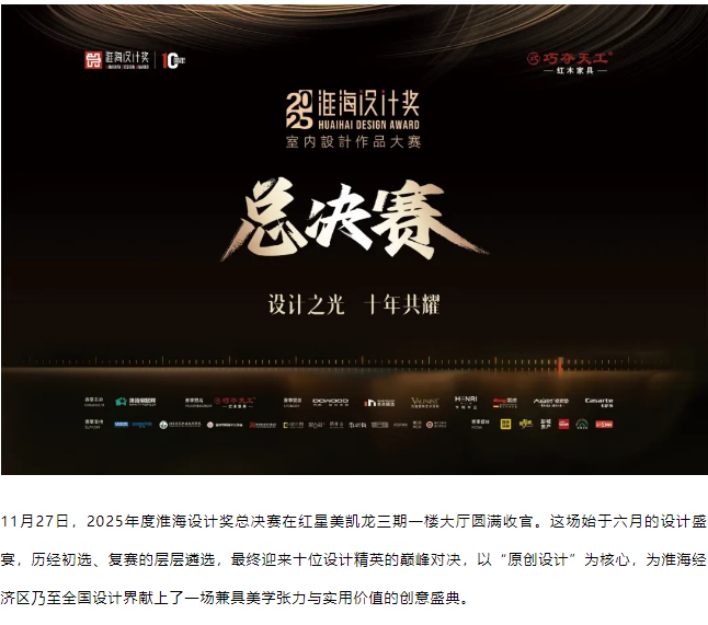 导语:11月27日,2025年度淮海设计奖总决赛在红星美凯龙三期一楼大厅圆满收官。这场始于六月的设计盛宴,历经初选、复赛的层层遴选,最终迎来十位设计精英的巅峰对决,以“原创设计”为核心,为淮海经济区乃至全国设计界献上了一场兼具美学张力与实用价值的创意盛典。