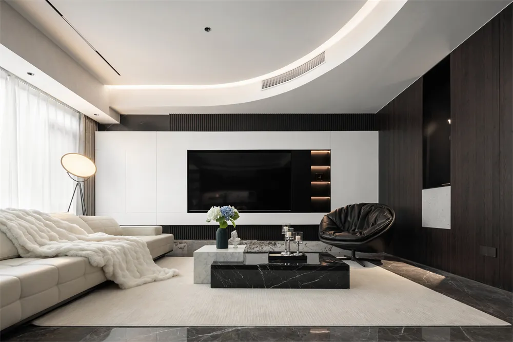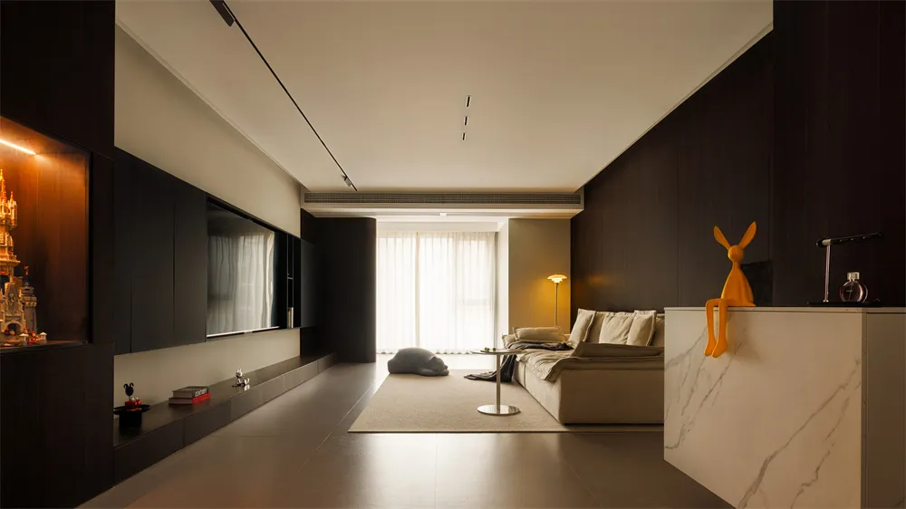 此方案采用了 强烈的对比去营造整体 侘寂风格的 的舒适氛围,在灯饰配饰上,以暖色为主的灯饰,整体无主灯设计,增加整体的对比感和设计感,墙顶地面采用了微水 ...
