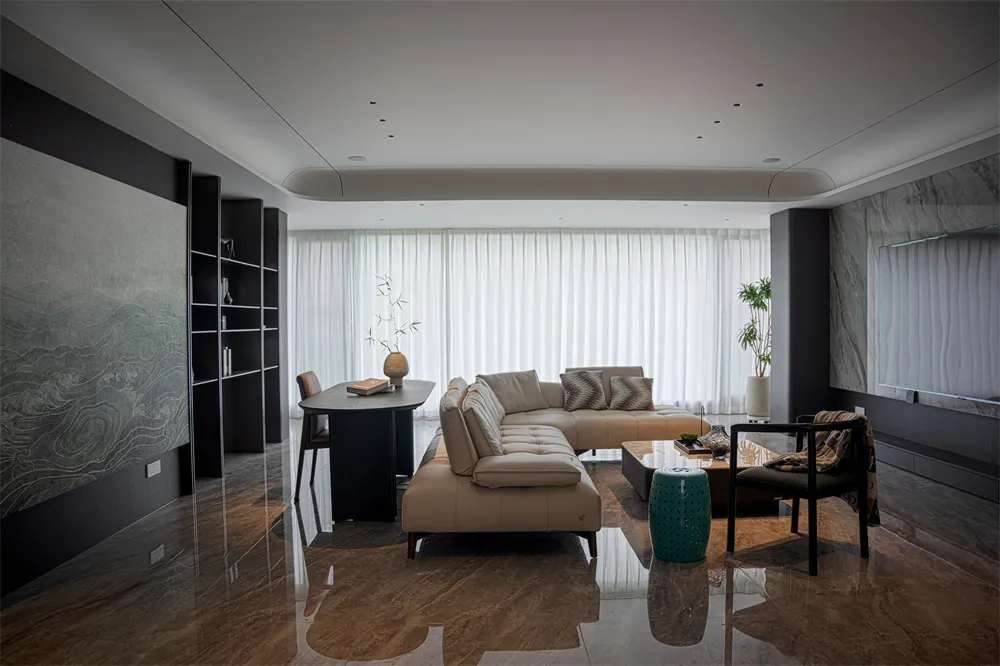 打破琐碎空间分割,以整体通畅宽广为基调,把空间融合。辅以高低错落的活动家具及软性隔断来打造空间层次感。结合苏氏园林手法,移步异景的方式提升空间气质。
